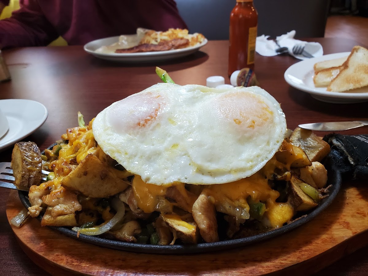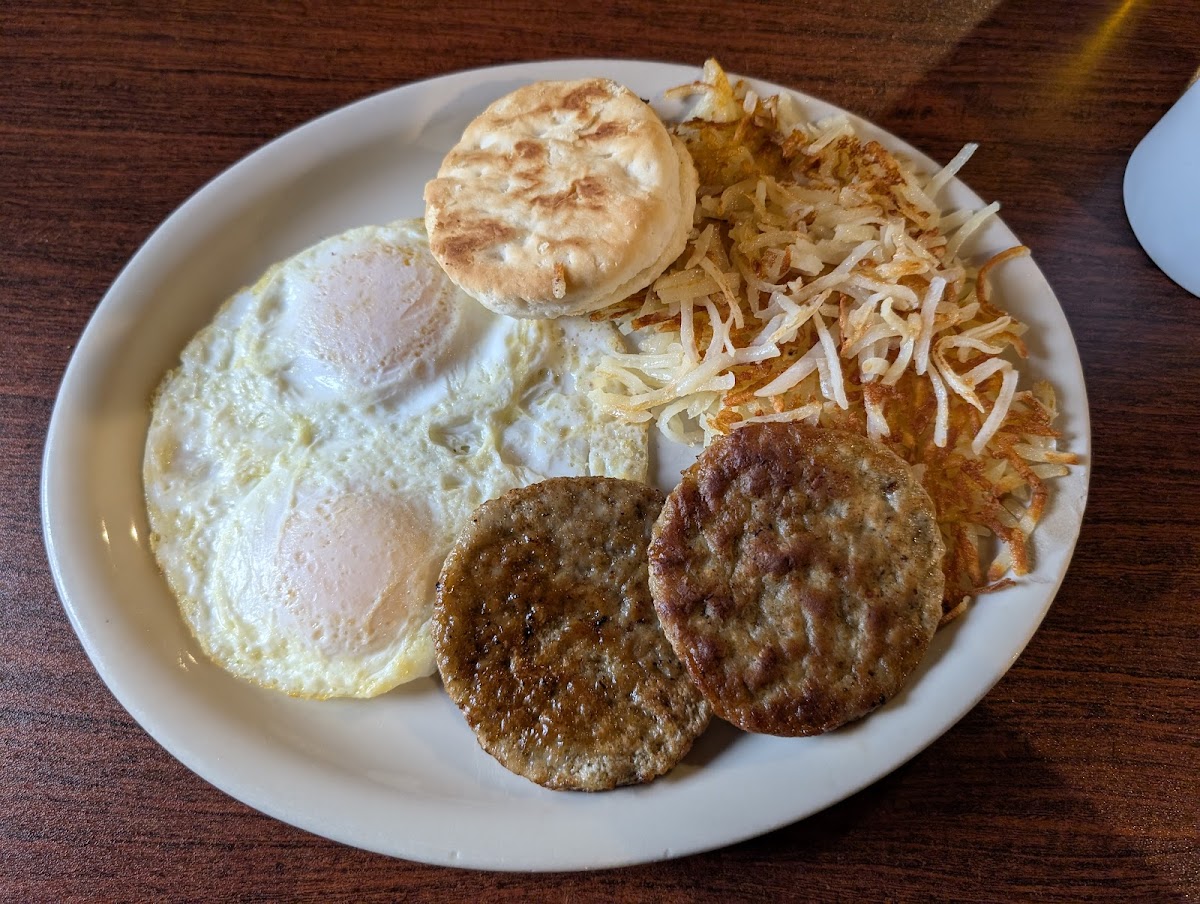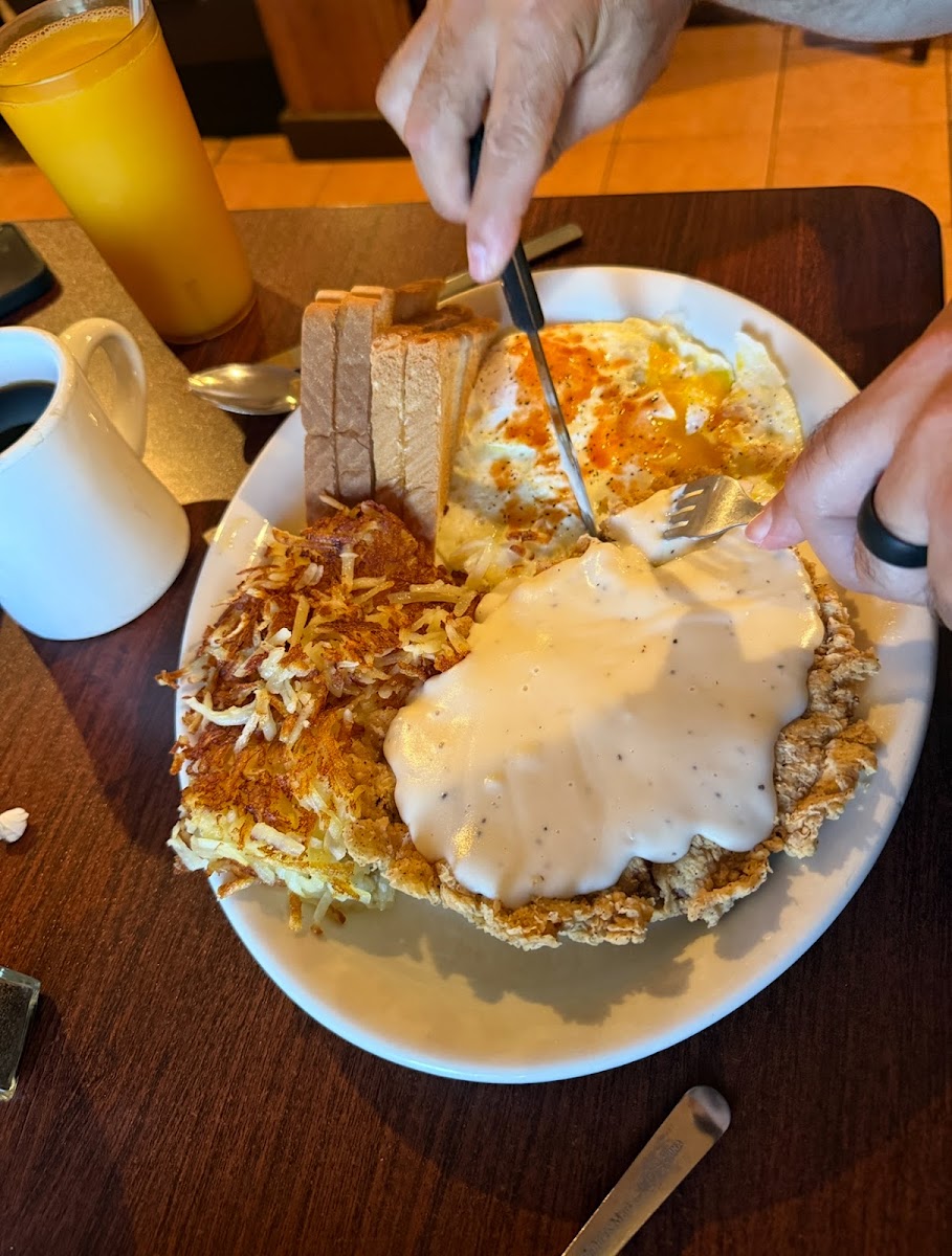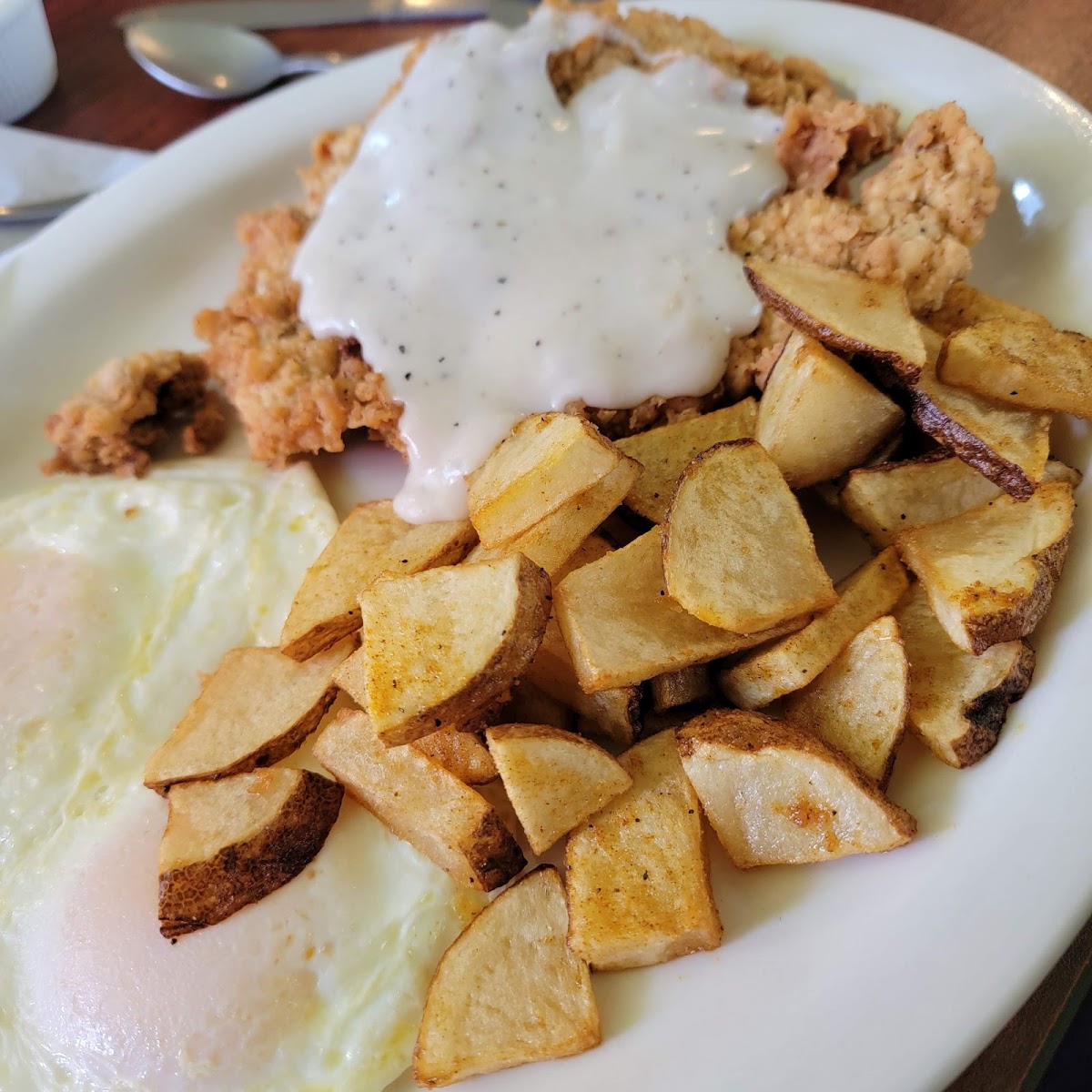A very country home style cafe that serves breakfast and dinner all day. Plenty of parking and servers were very helpful accommodating for plate choices. Very attentive to keeping coffee cup full. The menu could use updating to clear white background and larger fonts and simplify choices to less than 8 per category and a “build your own” . I ordered the hamburger steak brown gravy and green beans, was very good (skip the cheese on it). Clean eatery. TO THE OWNER: switch your garage paper towels for real paper towels or napkins. Will come back again if in the area.