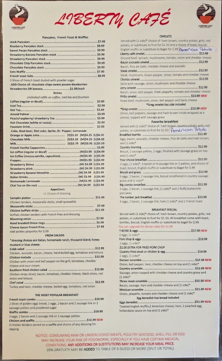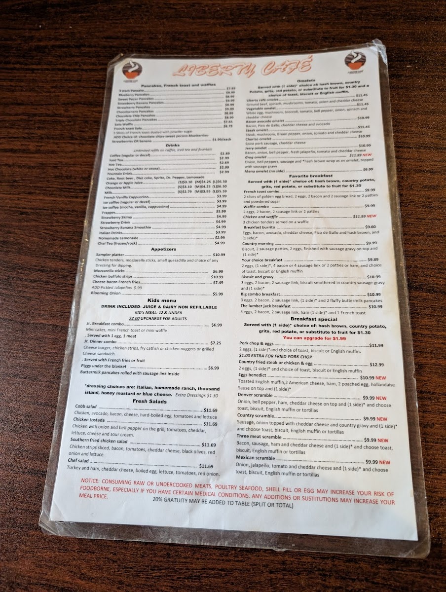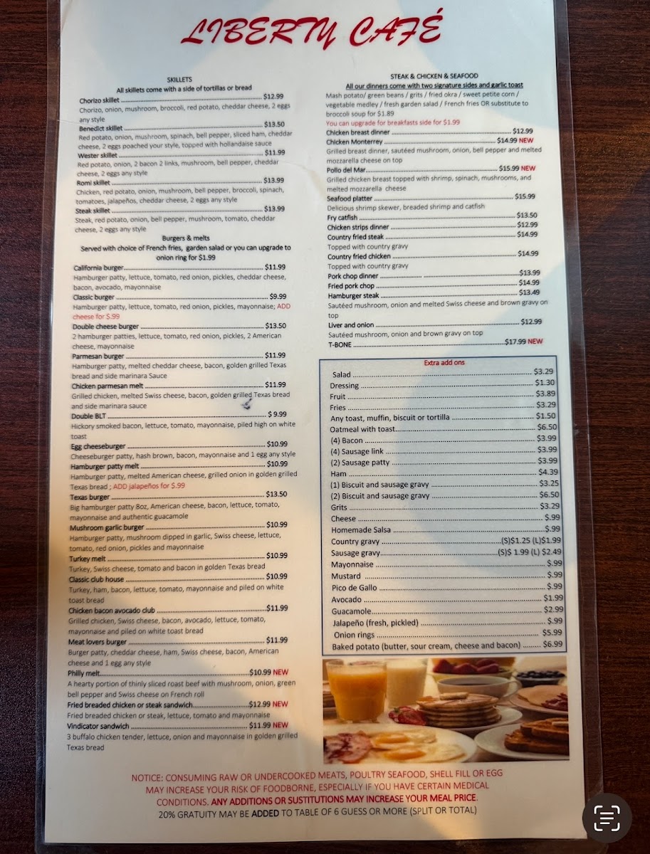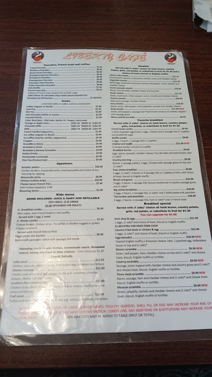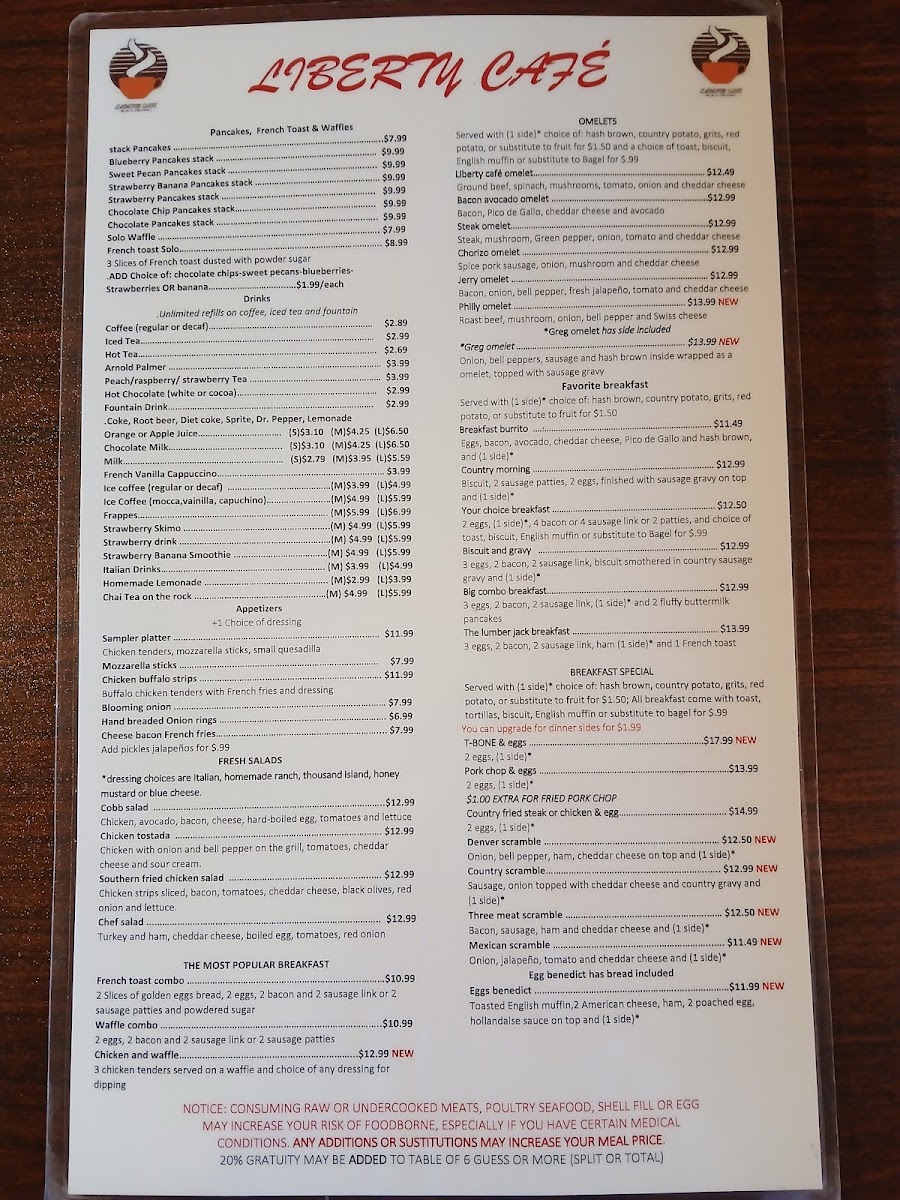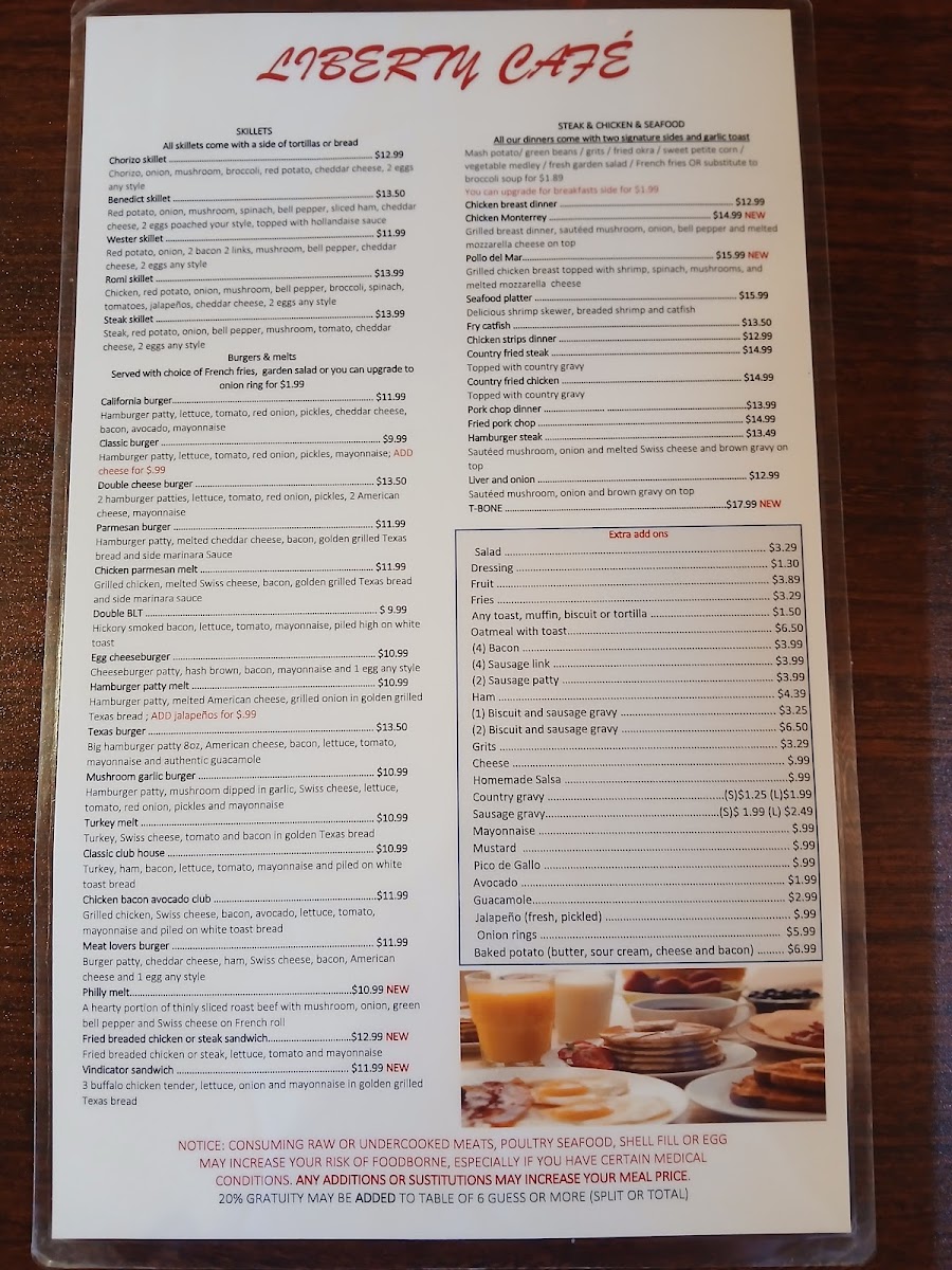 The menu at Liberty Cafe offers a straightforward, home-style dining experience that reflects the welcoming atmosphere of a classic neighborhood restaurant. Featuring hearty breakfast staples like fluffy pancakes and the signature Liberty Café Omelet, it’s a place many choose to start their day with familiar comfort foods. Throughout the day, guests can enjoy satisfying options such as the Chicken Fried Steak and Eggs, Stuffed Hamburger Steak, or the well-loved club sandwich, making it easy to settle in for a casual lunch or dinner.